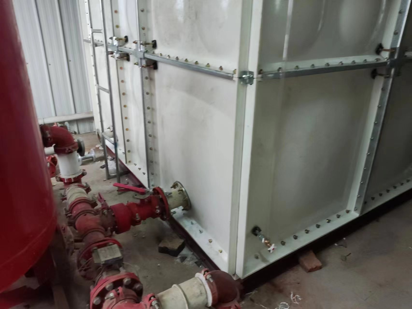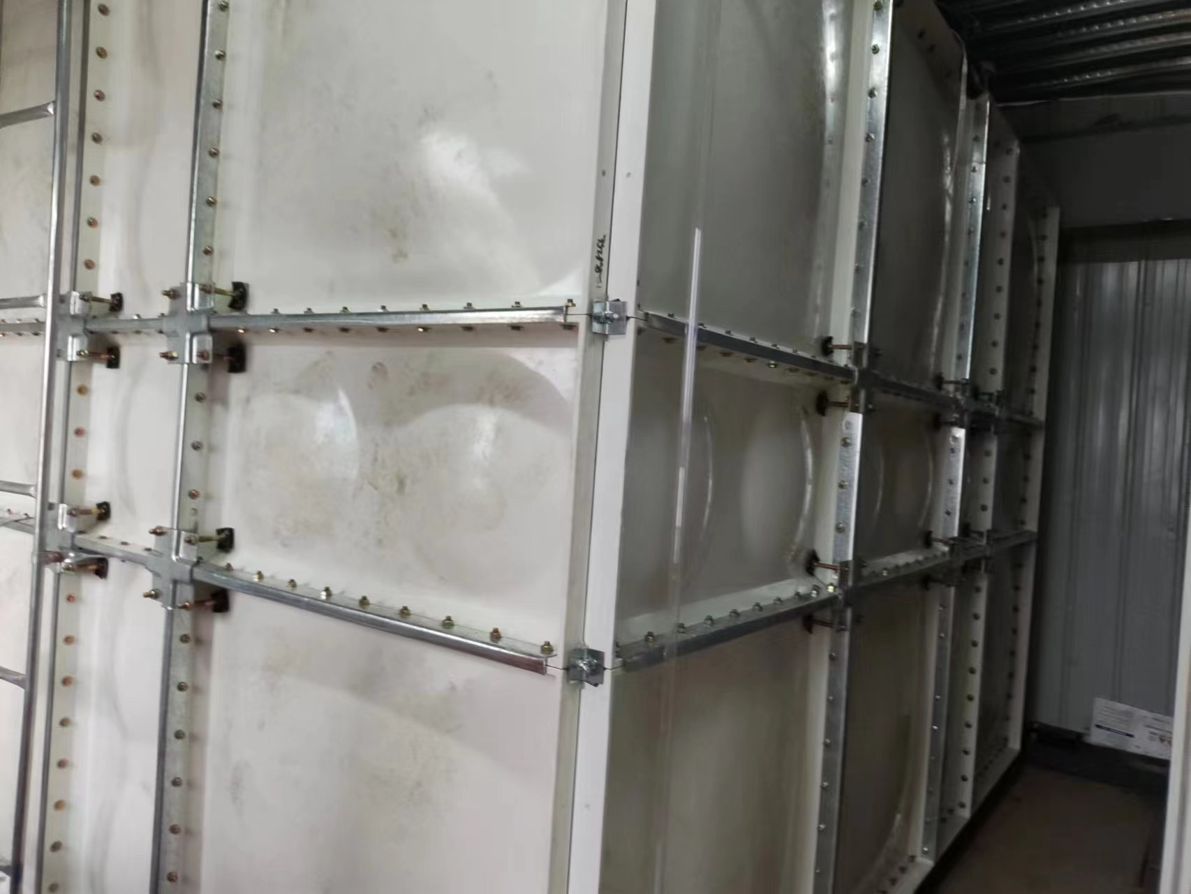 我司承接的山東省德州市平原縣紡興纖維廠地震災(zāi)后重建項目,21.9立方SMC玻璃鋼消防水箱已經(jīng)安裝試水完成。SMC組合式玻璃鋼水箱是一種普遍采用的儲水方式。是由SMC單元板現(xiàn)場組裝而成的一種水箱。單元板用SMC(sheet moulding compound)片材在高溫高壓下模壓成型,水箱內(nèi)采用加強(qiáng)式支撐,其鋼配件選用熱鍍鋅件和不銹鋼件均可。板塊厚度的選取依據(jù)板塊所受的壓力和所處的位置。有5mm、8mm、10mm、12mm、14mm、16mm等。